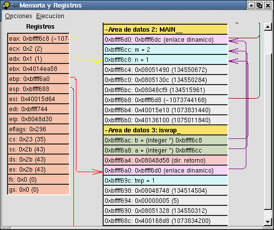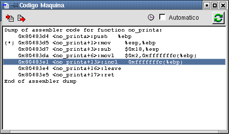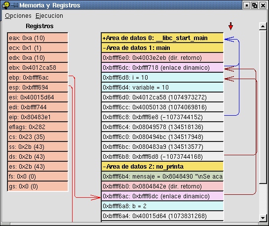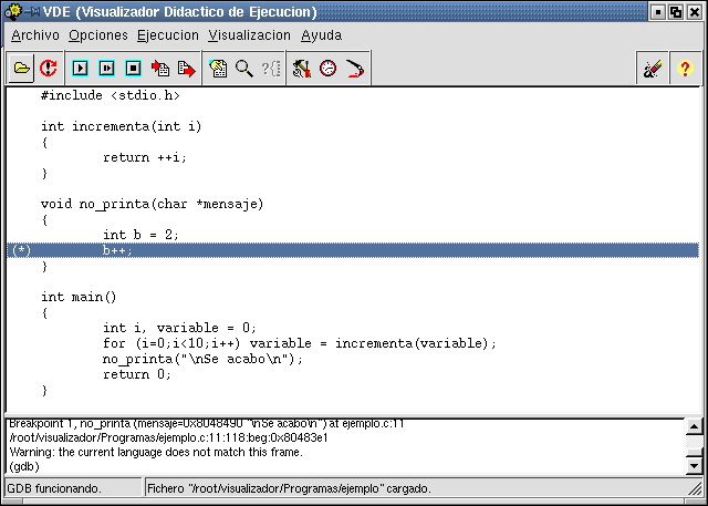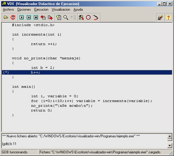 fuente, todos los comandos que se le envían al GDB y el menú de